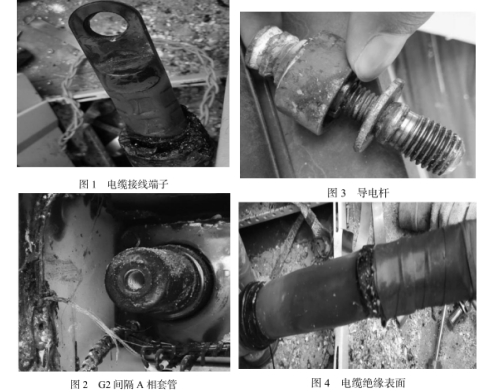 搶修人員對G2距離電纜撤除后,發(fā)現(xiàn)電纜接線端子(如圖1所示)氧化嚴峻,闡明此處遭受過高溫腐蝕,并且應(yīng)力錐靠近端子處的燒蝕痕跡也闡明晰插頭受高溫腐蝕;現(xiàn)場發(fā)現(xiàn)端子與環(huán)氧套管銅件的觸摸面存在顯著氧化,闡明高溫腐蝕時,端子與環(huán)氧套管銅件外表并未徹底嚴密貼合;查看套管內(nèi)部螺紋亮光正常(如圖2所示),闡明導(dǎo)電桿裝置緊固。環(huán)氧套管遭受高溫痕跡顯著,且銅件外表與端子觸摸面也有很顯著氧化痕跡,闡明在高溫發(fā)生時,端子與環(huán)氧套管銅件外表并未徹底嚴密貼合;現(xiàn)場對導(dǎo)電桿(如圖3所示)進行查看,發(fā)現(xiàn)變徑螺桿氧化,以及銅嵌件脫離環(huán)氧,熔融附于變徑螺桿上,都闡明此處經(jīng)受過高溫傳導(dǎo);對電纜應(yīng)力錐剝除后,發(fā)現(xiàn)電纜絕緣外表(如圖4所示)無顯著爬電痕跡,闡明應(yīng)力體部位未發(fā)生爬電毛病,從絕緣受高溫腐蝕和燒蝕判斷,高溫來自端子部位。